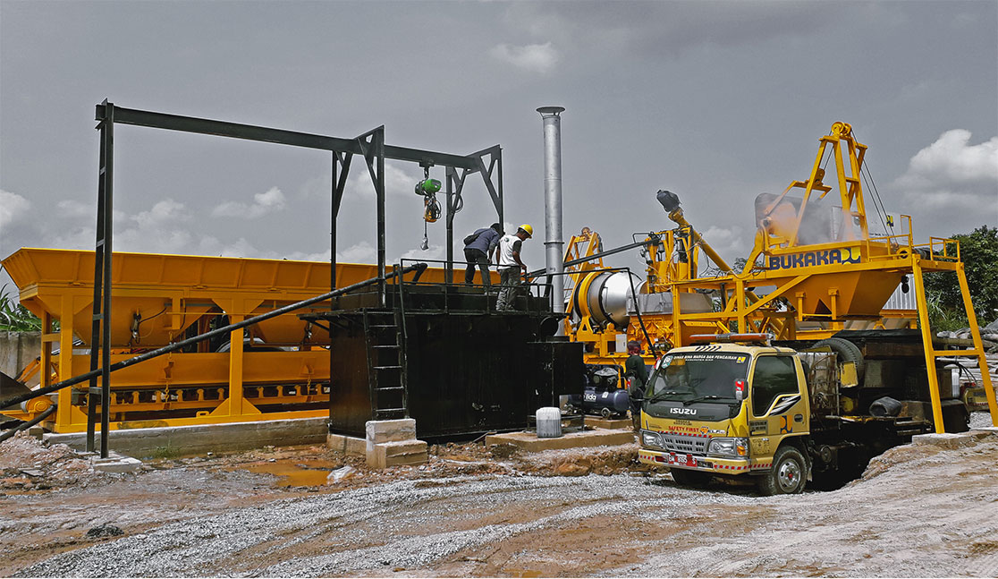 Bukaka Asphalt Mixing Plant type is planned to process a mixture of aggregate and asphalt (hot mix), with a capacity of 800 kg, 1000 kg and 1200 kg each of the mixing process (mixing circle). The composition of the mixture of aggregate set of four compartment Bins and system scales. Each bin is equipped with Pneumatic Gate.