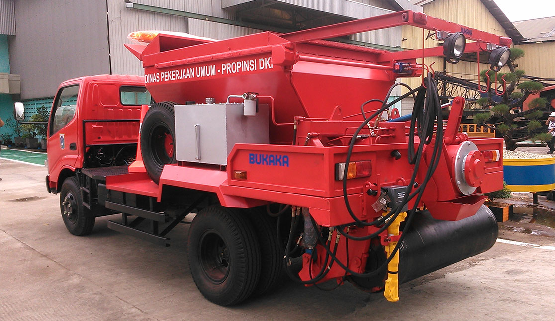 Bukaka Road Maintenance Truck, is one of the Car Care Products unit in a way designed to be used / damage-repair damage that occurred on the road with the integrated way. Hoper aggregate is made of steel material layered with insulation to maintain the asphalt temperature Hotmix remain on life.
