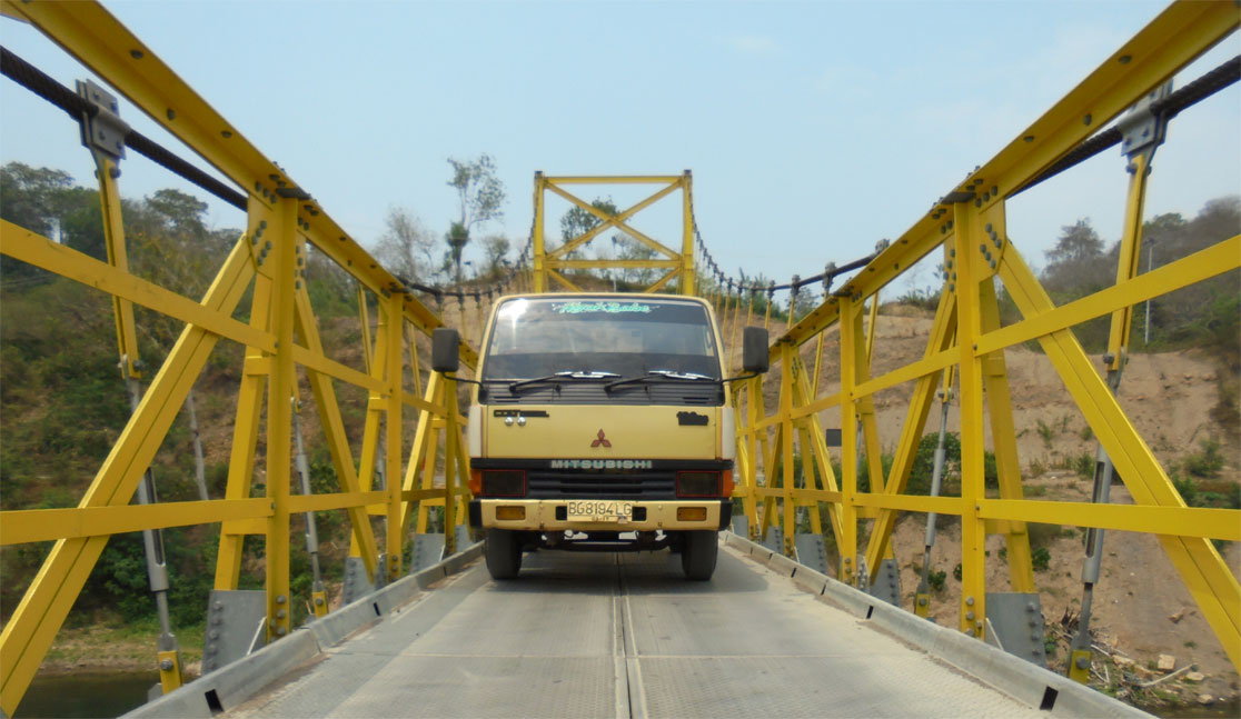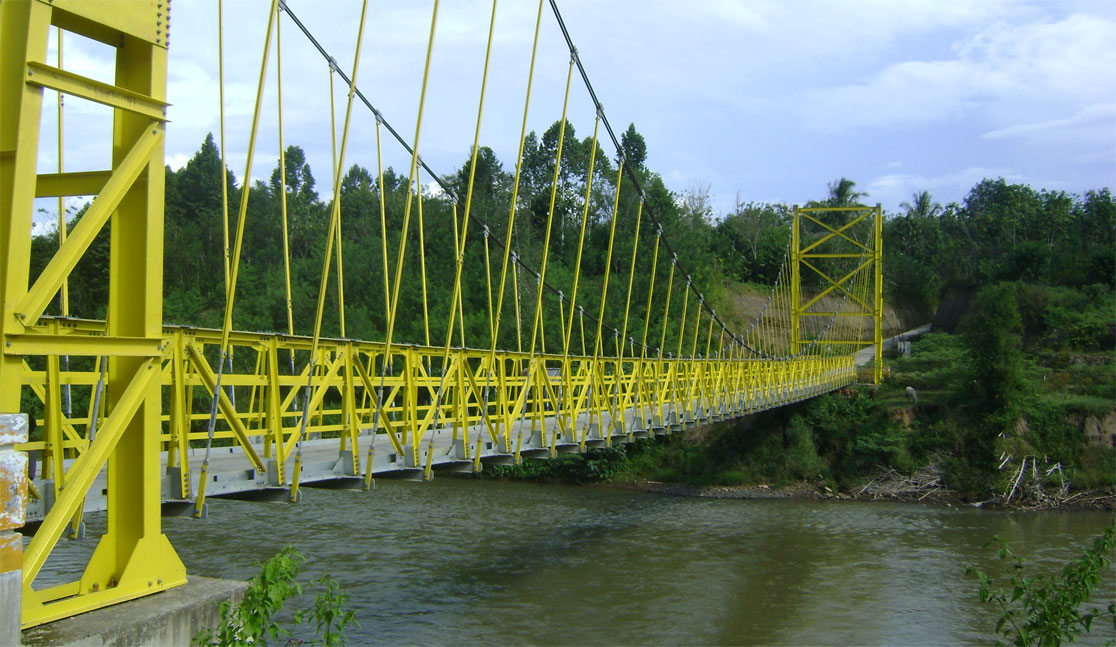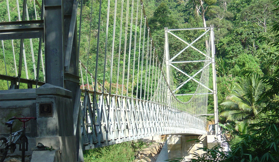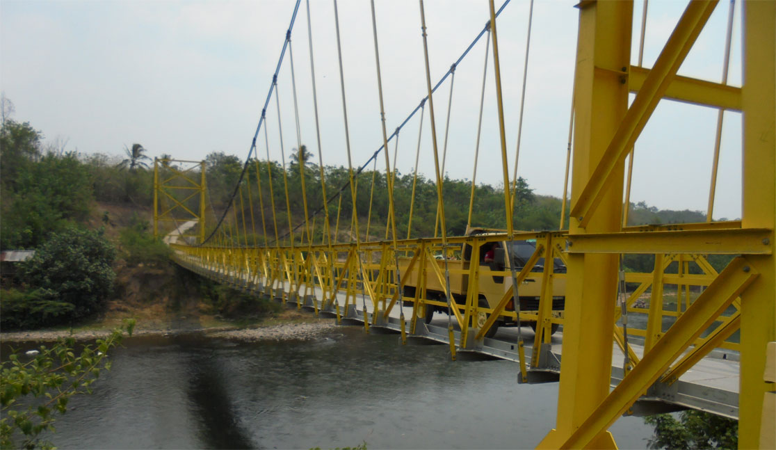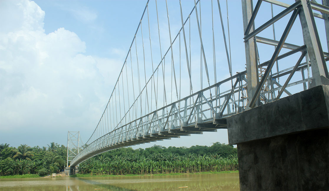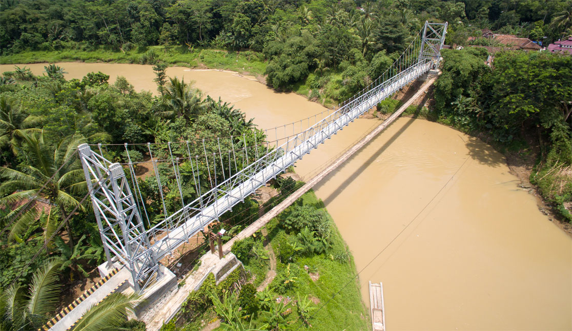 This bridge is planned to use the steel deck plate that can rivet the cross girder with bolts as its connector. This bridge is very suitable to support the development of the village economy. Some examples of Bukaka Suspension Bridge : Multifunction Suspension Bridge Span 176 Meters at Desa Sugiwaras-Lawang Agung, Kec. Tebing Tinggi Kab. Empat Lawang; our newest, Pedestrian Suspension Bridge Span 132 Meters at Kolelet, Kab. Lebak-Banten and Pedestrian Suspension Bridge Span 92 Meters at Rancawiru, Kab. Lebak-Banten.